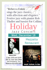 December 24, 2023: Rebecca was delighted to be selected to participate in the annual Mark Steyn Christmas Eve show. Listen at this link: https://www.steynonline.com/13987/christmas-eve-lessons-and-carols. Our arrangement of “Hark! The Herald Angels Sing” (47:50) is featured after a reading of the beautiful opening lines of the Gospel of John. Rob Thaller is on piano and Pat Collins is on bass. Recorded at Panacci Studios, Mississauga.
