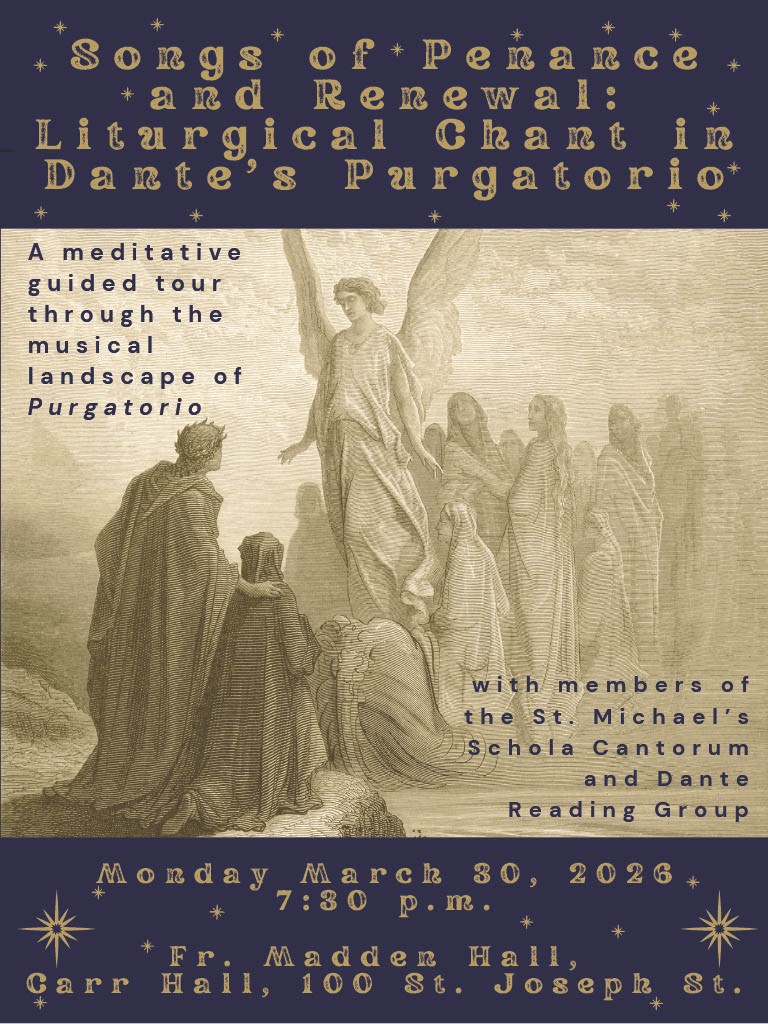 Songs of Penance and Renewal: Liturgical Chant in Dante’s Purgatorio, St. Mike’s College, UofT: Monday, March 30, 2026, 7:00 pm